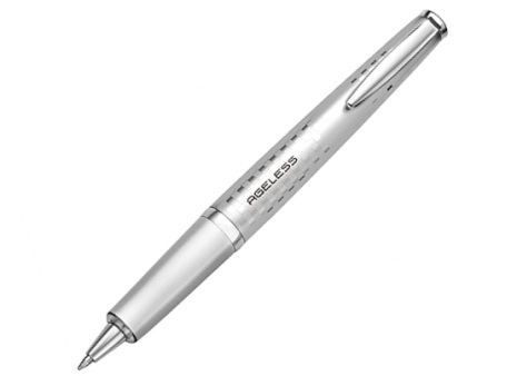 Bolígrafo con cuerpo metálico y fino grabado en laser de cuadrícula.